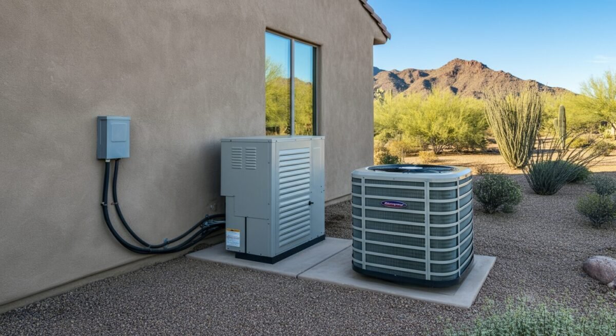 Festival Ranch’s arid desert climate with extreme dry heat, intense sun, and summer monsoon dust storms (haboobs) significantly impacts HVAC efficiency. The extreme heat means your AC works overtime, so a high-SEER2 rated unit is essential to minimize energy consumption and lower those hefty summer electric bills from SRP or APS. Don’t skimp on SEER2 ratings; they will pay off over the lifespan of the unit. High-MERV filters are also vital for capturing the fine dust particles prevalent in our air, especially after haboobs. Regular coil cleaning is also critical to maintain efficiency, as dust buildup can severely reduce cooling capacity. Many homes in the area have rooftop package units, which require specialized crane installation and maintenance knowledge. Choosing a contractor experienced with these systems is a must.